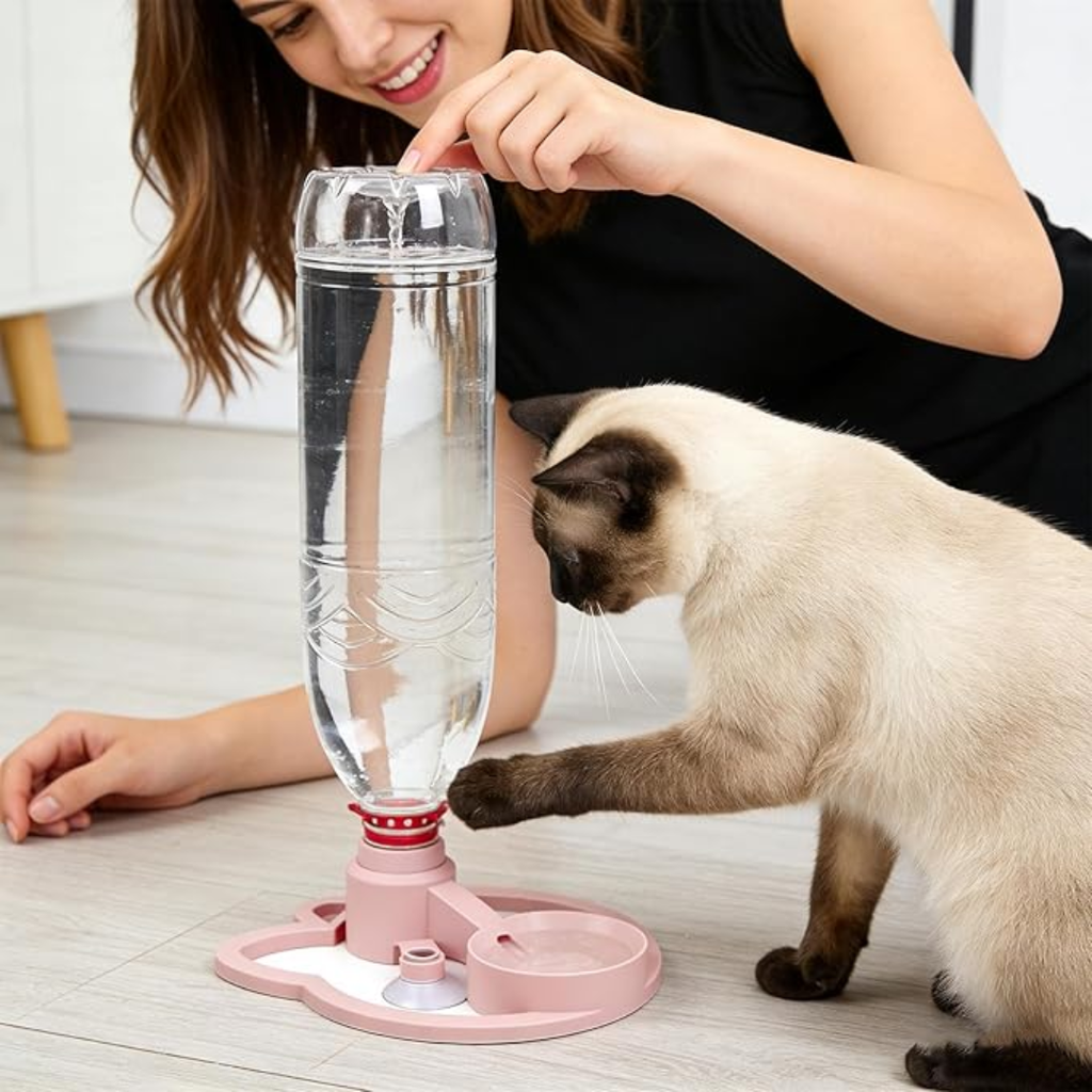 Basta fixar o suporte, encaixar a garrafa PET de cabeça para baixo e deixar os felinos se hidratarem com conforto e segurança. Uma solução inteligente que transforma um hábito essencial em algo natural e atrativo para os gatinhos.